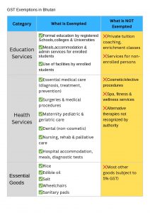 This table provides a comprehensive overview of GST exemptions and non-exemptions in Bhutan across key categories.