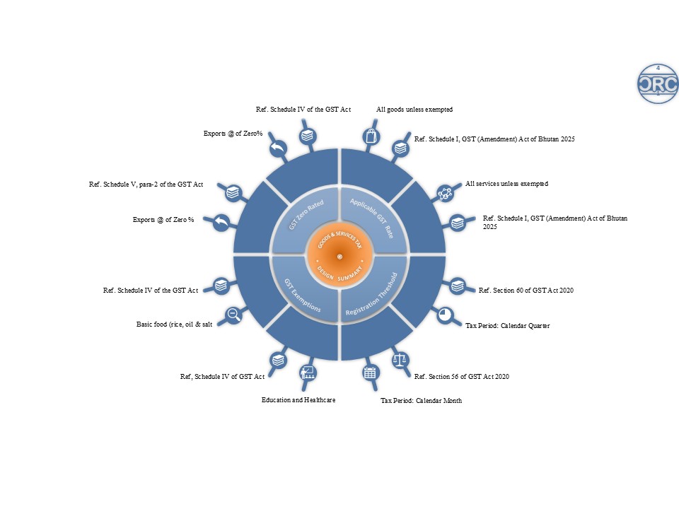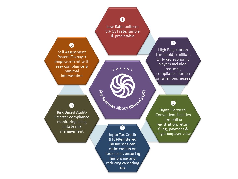 Goods and Services Tax (GST) is a consumption-based tax that is applied to most goods and services in Bhutan. It is charged at a standard rate of 5 percent and is collected at the point where goods or services are consumed. Under GST, the tax burden is borne by the final consumer, while businesses collect the GST and remit to the government on behalf of the consumer. To avoid tax on tax, businesses are allowed to claim back the GST paid on their purchases or import through a mechanism known as Input Tax Credit. This ensures that the tax is levied only on the value added at each stage of the supply chain.
